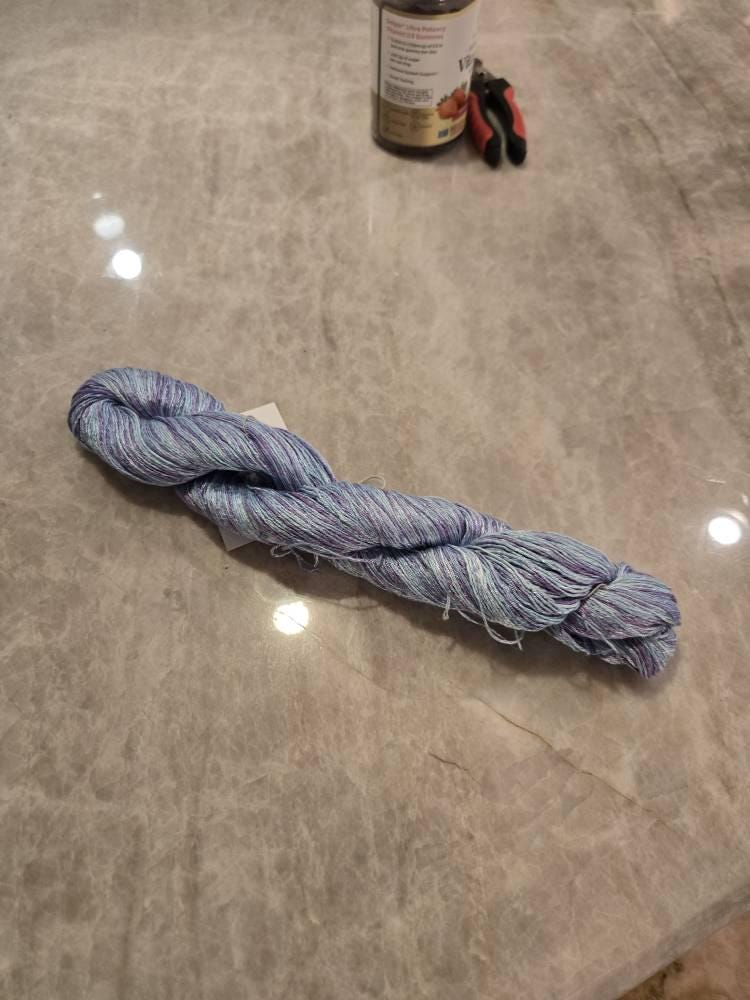 I hand-dyed this yarn in shades of sky blue, light blue, lavender, and medium purple. This yarn was wound into a large skein, dyed, rinsed and dried, and then rewound into smaller skeins. With the way that I do my dyeing the colors change randomly thru out the skein. I do my dyeing in small batches and what is available here is all that I dyed in this color way.